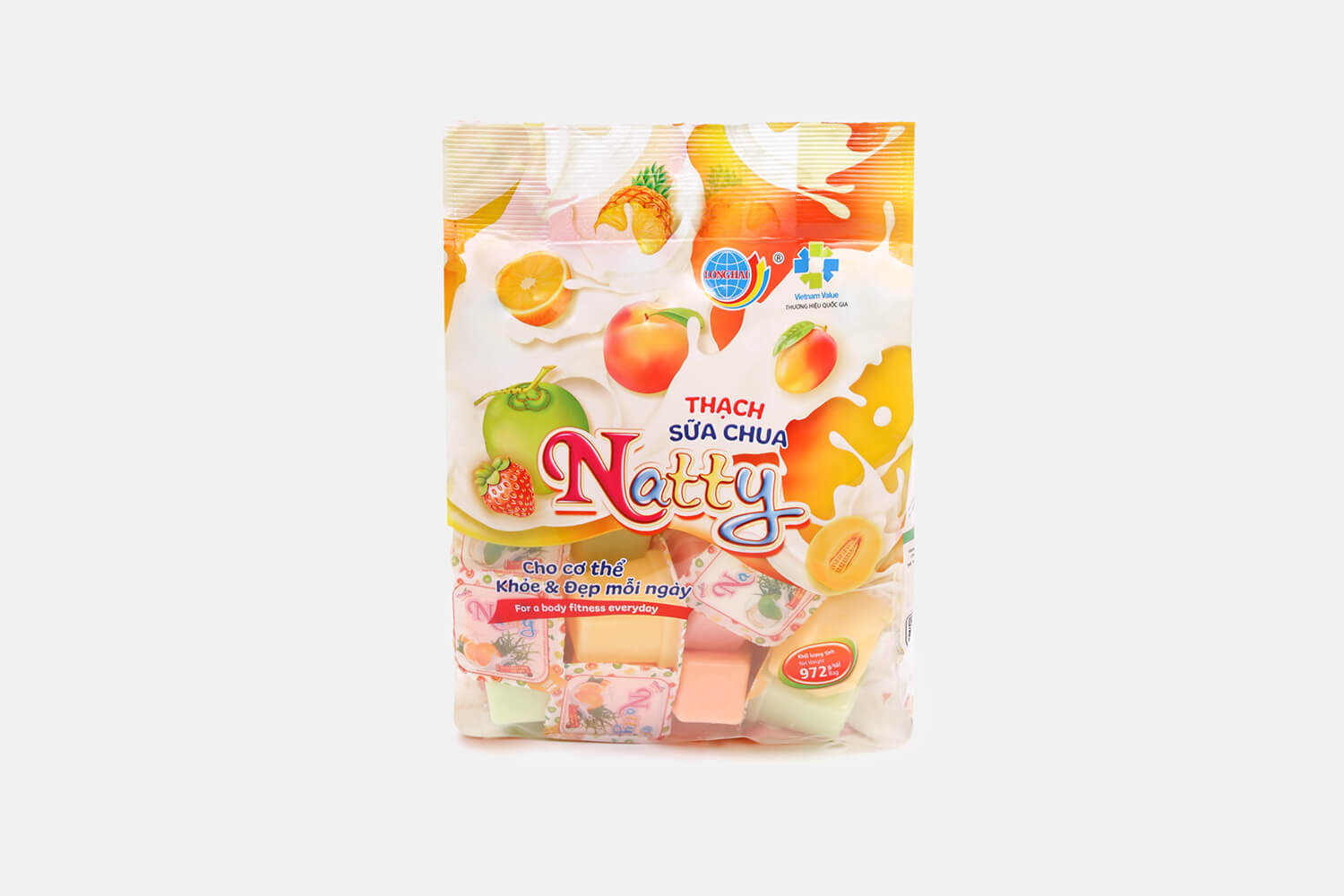 Thạch sữa chua Natty đóng gói túi nilon với khối lượng tịnh 972 g.